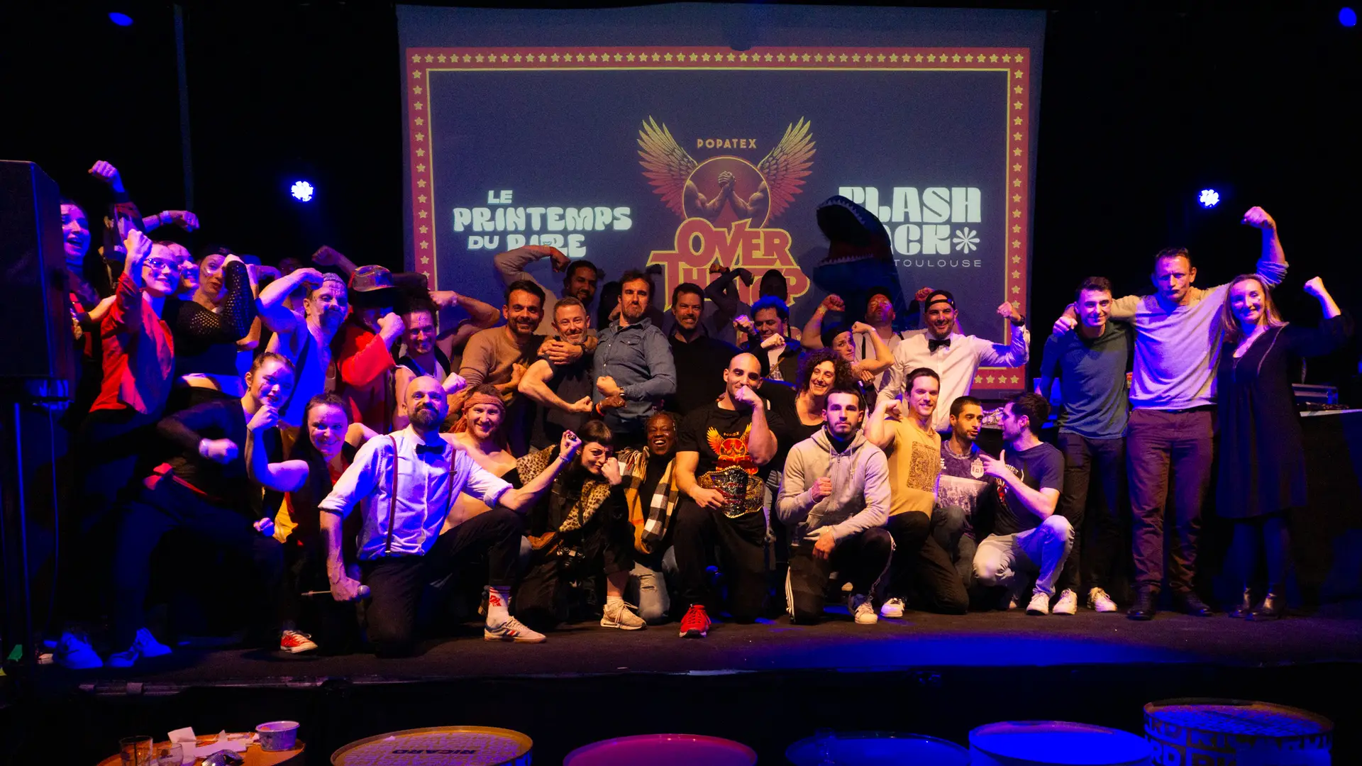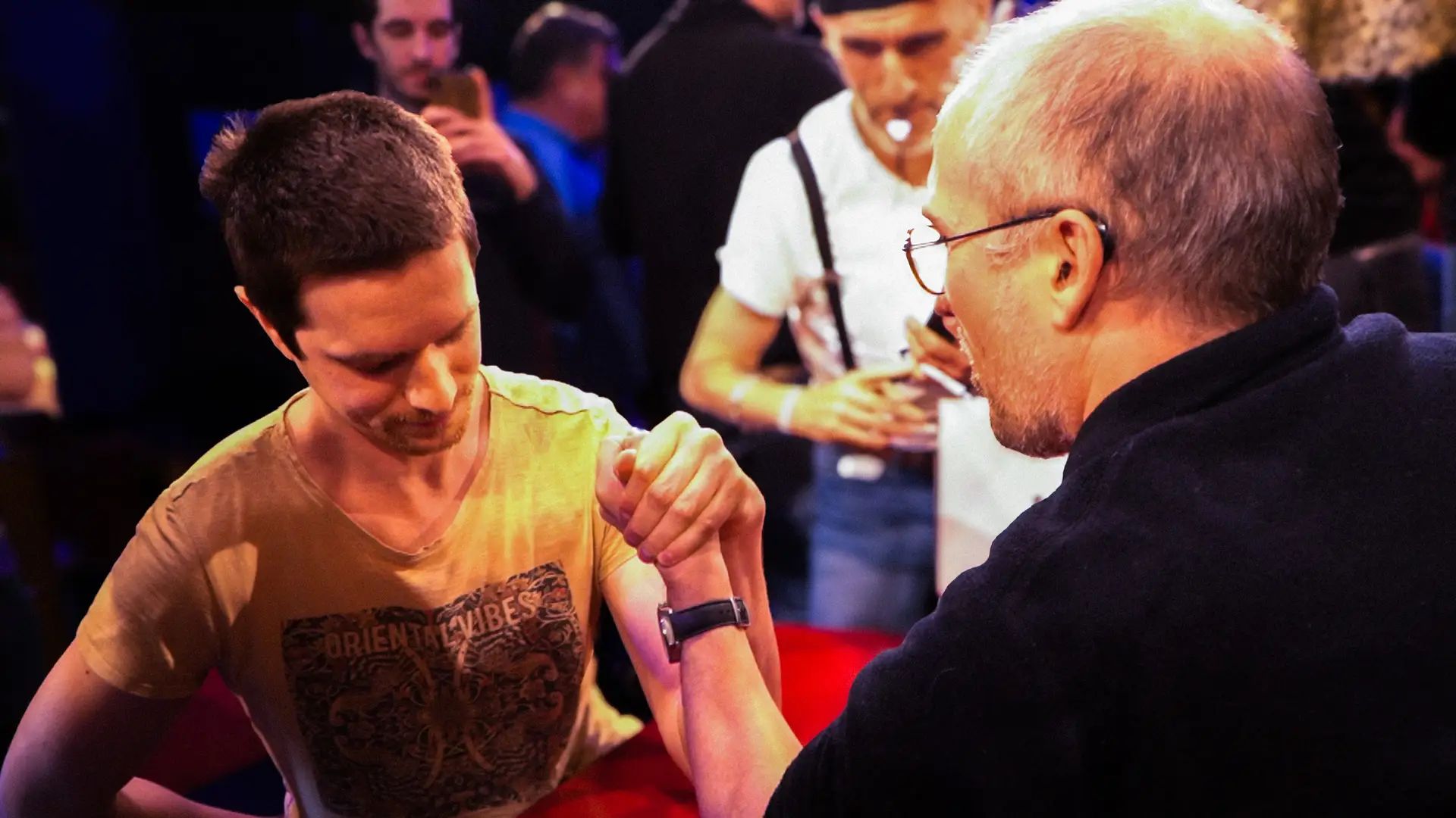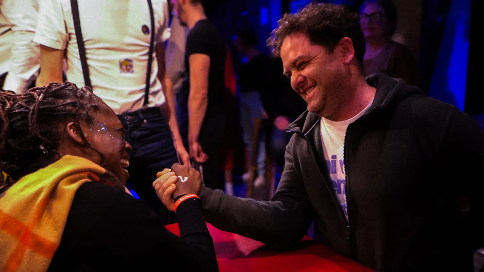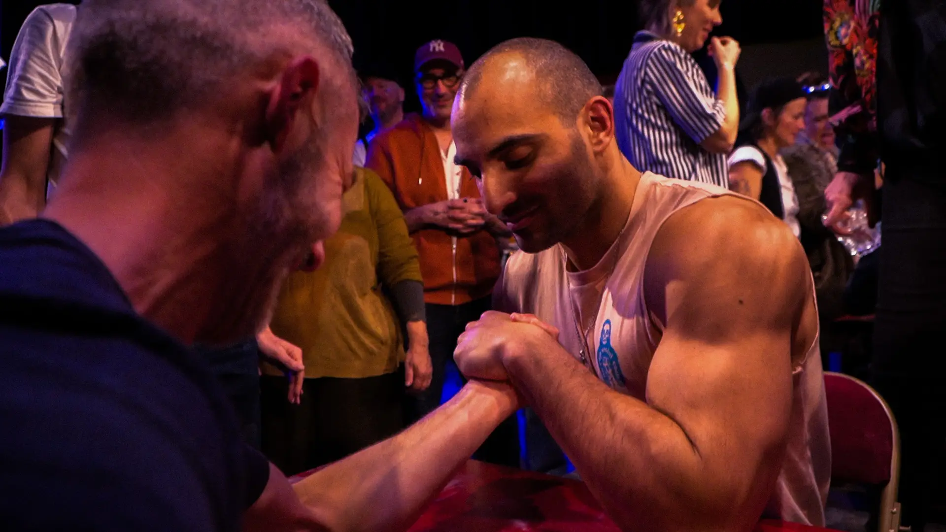 Vrai-faux tournoi de bras de fer sous forme de jeu à l’ambiance décalée : musique, cheerleadeurs-ses, arbitres influençables, projection d’extraits du film, présentateur loufoque, gages, mauvaise foi… tout est permis !